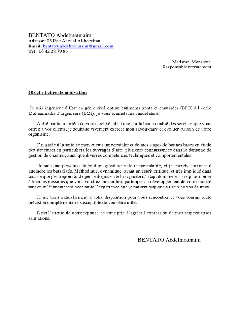 Un exemple de lettre de motivation trouvé sur le web propose la phrase suivante. Choisissez bien vos formules pour débuter et terminer votre lettre de motivation. Cela suppose toutefois que vous ayez déjà eu un premier contact positif avec linterlocuteur.